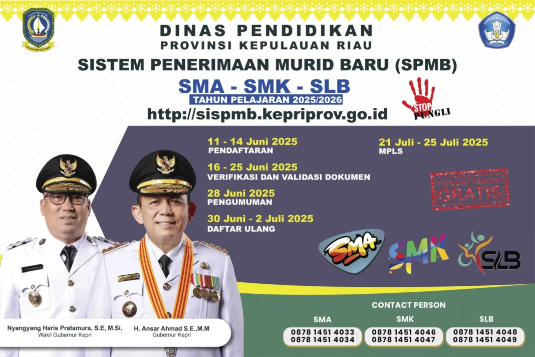 KEPRI, SK.co.id – Kabar gembira bagi calon siswa SMA, SMK, dan SLB di Kepulauan Riau! Dinas Pendidikan (Disdik) Provinsi Kepri mengumumkan pendaftaran Sistem Penerimaan Murid Baru (SPMB) tahun ajaran 2025/2026 akan dibuka mulai 11 Juni hingga 14 Juni 2025. Proses pendaftaran dilakukan secara online melalui laman resmi https://sispmb.kepriprov.go.id/.