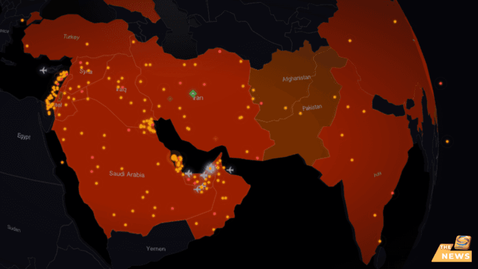 Berdasarkan data visual dari terminal intelijen, wilayah Iran, Irak, hingga sebagian Pakistan kini ditetapkan sebagai zona risiko tinggi dengan indikator warna merah api. Konsentrasi armada tempur terpantau sangat padat, meliputi: