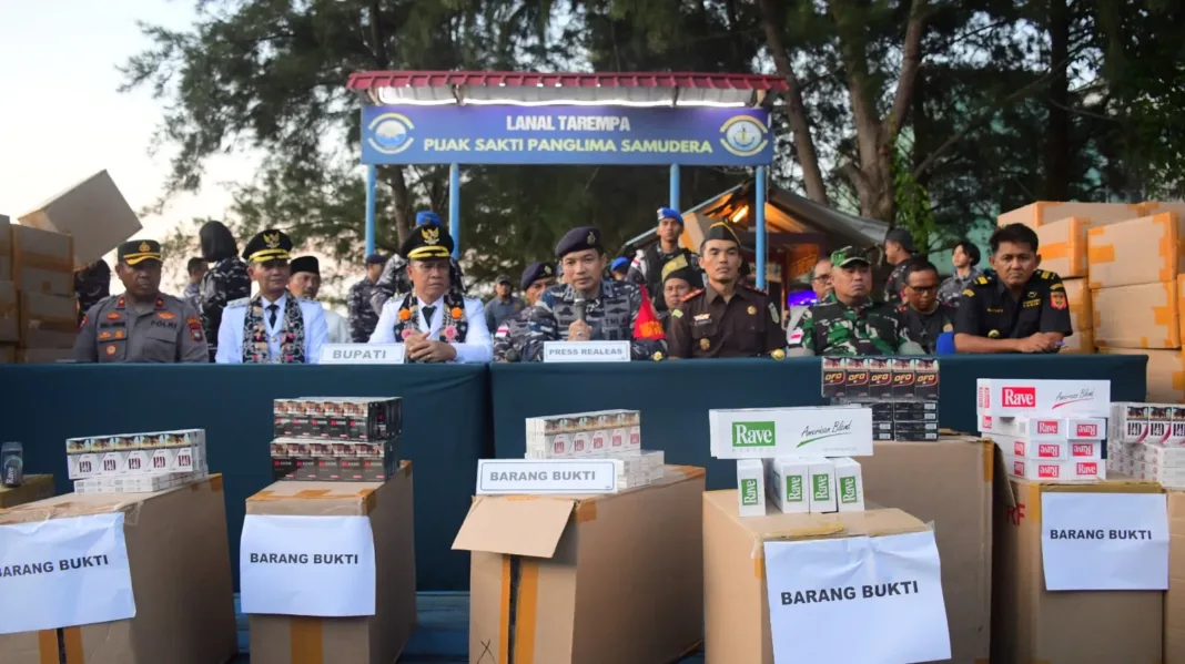 Anambas, SK.co.id – Pangkalan TNI Angkatan Laut (Lanal) Tarempa melalui Tim Fleet One Quick Response (F1QR) berhasil menggagalkan upaya penyelundupan dan peredaran rokok ilegal sebanyak lebih kurang 223 kardus di Pelabuhan Roro, Kecamatan Kute Siantan, Kabupaten Kepulauan Anambas. Dalam konferensi pers yang digelar, Komandan Lanal Tarempa, Letkol Laut (P) Ari Sukmana, S.E., M.Tr.Opsla, mengungkapkan bahwa rokok ilegal yang berhasil diamankan diperkirakan merugikan negara sebesar Rp 1,7 miliar.