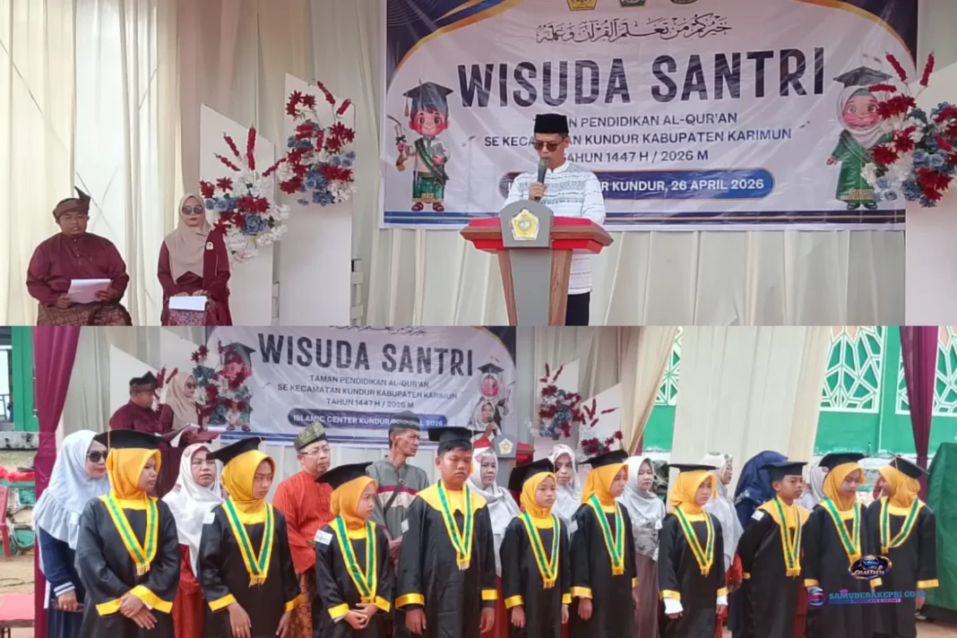 Kundur, SamuderaKepri – Kecamatan Kundur yang memiliki tiga kelurahan dan tiga desa dengan ratusan santri dari berbagai Taman Pendidikan Al-Qur’an (TPQ) menggelar acara wisuda santri pada Minggu (26/4/2026). Kegiatan berlangsung di area Islamic Center, tepat di sebelah Masjid, mulai pukul 08.00 WIB, dan dihadiri langsung oleh Bupati Karimun, H. Ing Iskandar.